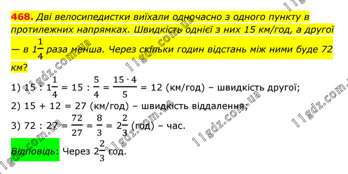 Дві велосипедистки виїхали одночасно з одного пункту в протилежних напрямках. Швидкість однієї з них 15 км/год, а другої — в 11/4 раза менша. Через скільки годин відстань між ними буде 72 км? 1) 15 : 11/4 = 15 : 5/4 = (15 ∙ 4)/5 = 12 (км/год) – швидкість другої; 2) 15 + 12 = 27 (км/год) – швидкість віддалення; 3) 72 : 27 = 72/27 = 8/3 = 22/3 (год) – час. Відповідь: Через 22/3 год.