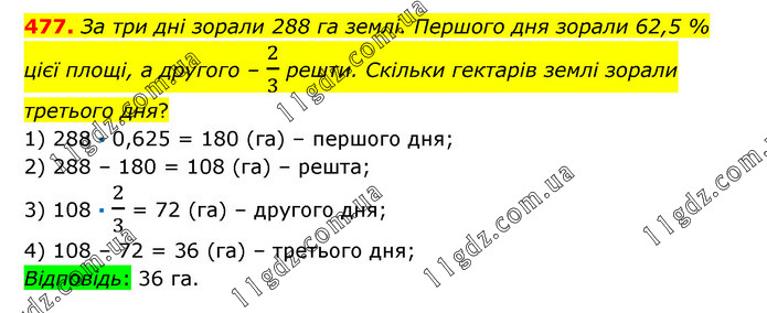 За три дні зорали 288 га землі. Першого дня зорали 62,5 % цієї площі, а другого – 2/3 решти. Скільки гектарів землі зорали третього дня? 1) 288 · 0,625 = 180 (га) – першого дня; 2) 288 – 180 = 108 (га) – решта; 3) 108 · 2/3 = 72 (га) – другого дня; 4) 108 – 72 = 36 (га) – третього дня; Відповідь: 36 га.