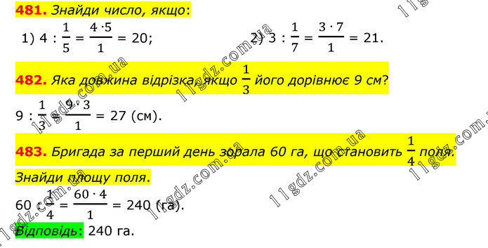 481. Знайди число, якщо: 1) 4 : 1/5 = (4 ∙5)/1 = 20; 2) 3 : 1/7 = (3 ∙ 7)/1 = 21. 482. Яка довжина відрізка, якщо 1/3 його дорівнює 9 см? 9 : 1/3 = (9 ∙ 3)/1 = 27 (см). 483. Бригада за перший день зорала 60 га, що становить 1/4 поля. Знайди площу поля. 60 : 1/4 = (60 ∙ 4)/1 = 240 (га). Відповідь: 240 га.