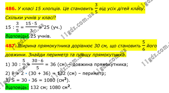486. У класі 15 хлопців. Це становить 3/5 від усіх дітей класу. Скільки учнів у класі? 15 : 3/5 = (15 ∙ 5)/3 = 25 (уч.) Відповідь: 25 учнів. 487. Ширина прямокутника дорівнює 30 см, що становить 5/6 його довжини. Знайди периметр та площу прямокутника. 1) 30 : 5/6 = (30 ∙ 6)/5 = 36 (см) – довжина прямокутника; 2) Р = 2 · (30 + 36) = 132 (см) – периметр; 3) S = 30 · 36 = 1080 (см2). Відповідь: 132 см; 1080 см2.