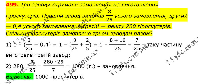 Три заводи отримали замовлення на виготовлення гіроскутерів. Перший завод виконав 8/25 усього замовлення, другий — 0,4 усього замовлення, а третій — решту 280 гіроскутерів. Скільки гіроскутерів замовлено трьом заводам разом? 1) 1 – (8/25 + 0,4) = 1 – (8/25 + 2/5) = 1 – (8 + 10)/25 = 7/25 – таку частину виготовив третій завод; 2) 280 : 7/25 = (280 ∙ 25)/7 = 1000 (г.) – замовлення. Відповідь: 1000 гіроскутерів.