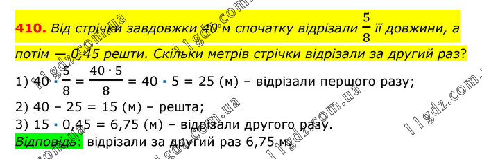 Від стрічки завдовжки 40 м спочатку відрізали 5/8 її довжини, а потім — 0,45 решти. Скільки метрів стрічки відрізали за другий раз? 1) 40 · 5/8 = (40 ∙ 5)/8 = 40 · 5 = 25 (м) – відрізали першого разу; 2) 40 – 25 = 15 (м) – решта; 3) 15 · 0,45 = 6,75 (м) – відрізали другого разу. Відповідь: відрізали за другий раз 6,75 м.
