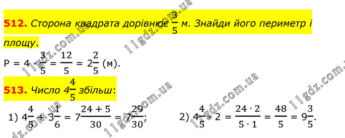 512. Сторона квадрата дорівнює 3/5 м. Знайди його периметр і площу. Р = 4 · 3/5 = 12/5 = 22/5 (м). 513. Число 44/5 збільш: 1) 44/5 + 31/6 = 7(24 + 5)/30 = 729/30; 2) 44/5 · 2 = (24 ∙ 2)/(5 ∙ 1) = 48/5 = 93/5.