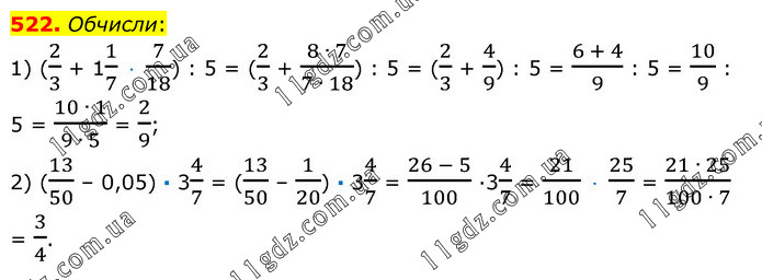 Обчисли: 1) (2/3 + 11/7 · 7/18) : 5 = (2/3 + (8 ∙ 7)/(7 ∙ 18)) : 5 = (2/3 + 4/9) : 5 = (6 + 4)/9 : 5 = 10/9 : 5 = (10 ∙ 1)/(9 ∙ 5) = 2/9; 2) (13/50 – 0,05) · 34/7 = (13/50 – 1/20) · 34/7 = (26 - 5)/100 ∙34/7 = 21/100 · 25/7 = (21 ∙ 25)/(100 ∙ 7) = 3/4.