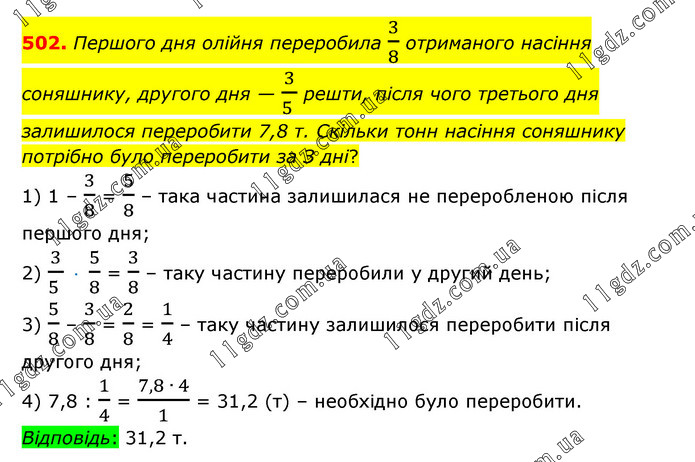 Першого дня олійня переробила 3/8 отриманого насіння соняшнику, другого дня — 3/(5 ) решти, після чого третього дня залишилося переробити 7,8 т. Скільки тонн насіння соняшнику потрібно було переробити за З дні? 1) 1 – 3/8 = 5/8 – така частина залишилася не переробленою після першого дня; 2) 3/(5 ) · 5/8 = 3/8 – таку частину переробили у другий день; 3) 5/8 – 3/8 = 2/8 = 1/4 – таку частину залишилося переробити після другого дня; 4) 7,8 : 1/4 = (7,8 ∙ 4)/1 = 31,2 (т) – необхідно було переробити. Відповідь: 31,2 т.