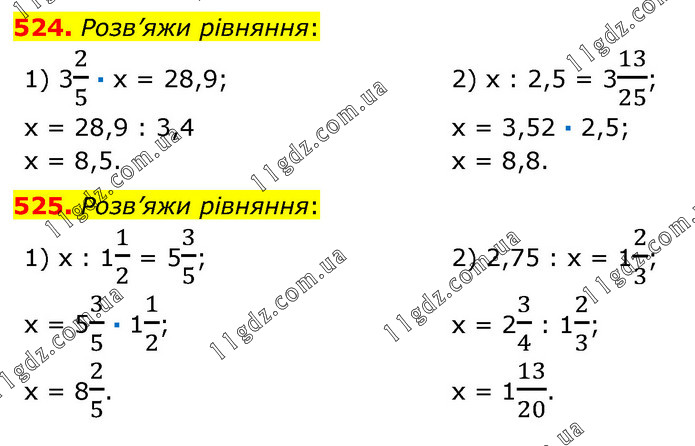524. Розв’яжи рівняння: 1) 32/5 · х = 28,9; х = 28,9 : 3,4 х = 8,5. 2) х : 2,5 = 313/25; х = 3,52 · 2,5; х = 8,8. 525. Розв’яжи рівняння: 1) х : 11/2 = 53/5; х = 53/5 · 11/2; х = 82/5. 2) 2,75 : х = 12/3; х = 23/4 : 12/3; х = 113/20.