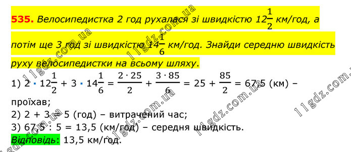 Велосипедистка 2 год рухалася зі швидкістю 121/2 км/год, а потім ще 3 год зі швидкістю 141/6 км/год. Знайди середню швидкість руху велосипедистки на всьому шляху. 1) 2 · 121/2 + 3 · 141/6 = (2 ∙ 25)/2 + (3 ∙ 85)/6 = 25 + 85/2 = 67,5 (км) – проїхав; 2) 2 + 3 = 5 (год) – витрачений час; 3) 67,5 : 5 = 13,5 (км/год) – середня швидкість. Відповідь: 13,5 км/год.