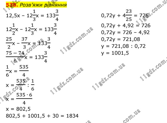 Розв’яжи рівняння 12,5х – 121/3х = 1333/4 121/2х – 121/3х = 1333/4 25/2х – 37/3х = 1333/4 (75 - 74)/6х = 1333/4 1/6х = 535/4 х = 535/4 : 1/6 х = (535 ∙ 6)/4 х = 802,5 0,72у + 423/25 = 726 0,72у + 4,92 = 726 0,72у = 726 – 4,92 0,72у = 721,08 у = 721,08 : 0,72 у = 1001,5 802,5 + 1001,5 + 30 = 1834