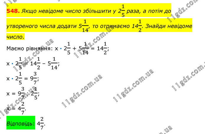 Якщо невідоме число збільшити у 21/5 раза, а потім до утвореного числа додати 51/14, то отримаємо 141/2. Знайди невідоме число. Маємо рівняння: х · 21/5 + 51/14 = 141/2; х · 21/5 = 141/2 – 51/14; х · 21/5 = 93/7; х = 93/7 : 21/5; х = 42/7. Відповідь: 42/7.