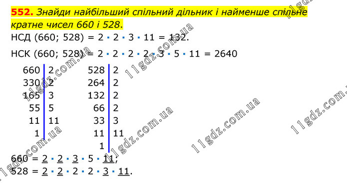 Знайди найбільший спільний дільник і найменше спільне кратне чисел 660 і 528. НСД (660; 528) = 2 · 2 · 3 · 11 = 132. НСК (660; 528) = 2 · 2 · 2 · 2 · 3 · 5 · 11 = 2640 660 = 2 · 2 · 3 · 5 · 11; 528 = 2 · 2 · 2 · 2 · 3 · 11.