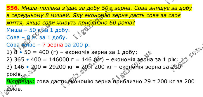 Миша-полівка з’їдає за добу 50 г зерна. Сова знищує за добу в середньому 8 мишей. Яку економію зерна дасть сова за своє життя, якщо сови живуть приблизно 60 років? Миша – 50 г за 1 добу. Сова – 8 м. за 1 добу. Сова живе – ? зерна за 200 р. 1) 8 • 50 = 400 (г) – економія зерна за 1 добу; 2) 365 • 400 = 146000 г = 146 (кг) – економія зерна за 1 рік; 3) 146 • 200 = 29200 кг = 29 т 200 кг – економія зерна за 200 років. Відповідь: сова дасть економію зерна приблизно 29 т 200 кг за 200 років.