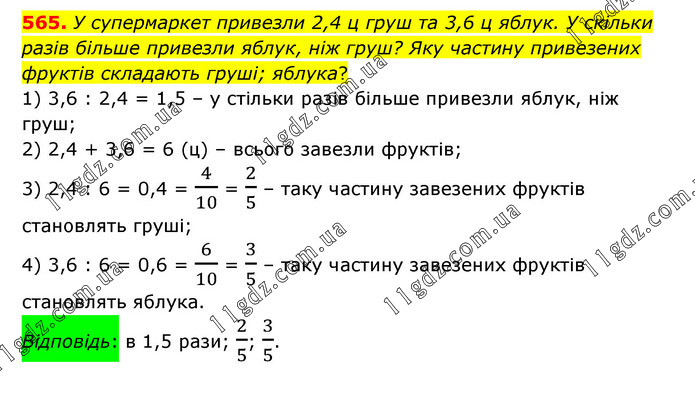 У супермаркет привезли 2,4 ц груш та 3,6 ц яблук. У скільки разів більше привезли яблук, ніж груш? Яку частину привезених фруктів складають груші; яблука? 1) 3,6 : 2,4 = 1,5 – у стільки разів більше привезли яблук, ніж груш; 2) 2,4 + 3,6 = 6 (ц) – всього завезли фруктів; 3) 2,4 : 6 = 0,4 = 4/10 = 2/5 – таку частину завезених фруктів становлять груші; 4) 3,6 : 6 = 0,6 = 6/10 = 3/5 – таку частину завезених фруктів становлять яблука. Відповідь: в 1,5 рази; 2/5; 3/5.