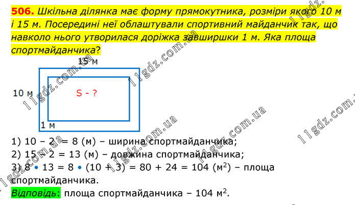 Шкільна ділянка має форму прямокутника, розміри якого 10 м і 15 м. Посередині неї облаштували спортивний майданчик так, що навколо нього утворилася доріжка завширшки 1 м. Яка площа спортмайданчика? 1) 10 – 2 = 8 (м) – ширина спортмайданчика; 2) 15 – 2 = 13 (м) – довжина спортмайданчика; 3) 8 • 13 = 8 • (10 + 3) = 80 + 24 = 104 (м2) – площа спортмайданчика. Відповідь: площа спортмайданчика – 104 м2.