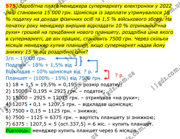 Заробітна плата менеджера супермаркету електроніки у 2022 році становила 15 000 грн. Щомісяця із зарплати утримувалося 18 % податку на доходи фізичних осіб та 1,5 % військового збору. На початку року менеджер вирішив відкладати 10 % отриманих «на руки» грошей на придбання нового планшету, роздрібна ціна якого в супермаркеті, де він працює, становить 7500 грн. Через скільки місяців менеджер купив планшет, якщо супермаркет надав йому знижку 15 % від роздрібної ціни? З/п – 15000 грн. Податки – 18% + 1,5% від Відкладав – 10% щомісяця від ? р. Планшет – (100% - 15%) від 7500 грн. 1) 18 + 1,5 = 19,5% = 0,195 – розмір податку; 2) 15000 • 0,195 = 2925 грн. – податок; 3) 15000 – 2925 = 12075 грн. – отримував «на руки»; 4) 12075 • 0,1 = 1207,5 грн. – відкладав щомісяця; 5) 7500 • 0,15 = 1125 грн. – знижка; 6) 7500 – 1125 = 6375 грн. – вартість планшету зі знижкою; 7) 6375 : 1207,5 = 5 (ост.337,5) = 6 міс. – купить планшет. Відповідь: менеджер купить планшет через 6 місяців.