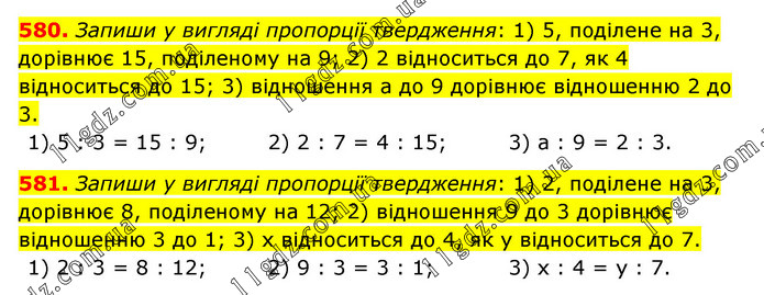 580. Запиши у вигляді пропорції твердження: 1) 5, поділене на 3, дорівнює 15, поділеному на 9; 2) 2 відноситься до 7, як 4 відноситься до 15; 3) відношення а до 9 дорівнює відношенню 2 до 3. 1) 5 : 3 = 15 : 9; 2) 2 : 7 = 4 : 15; 3) а : 9 = 2 : 3. 581. Запиши у вигляді пропорції твердження: 1) 2, поділене на 3, дорівнює 8, поділеному на 12; 2) відношення 9 до 3 дорівнює відношенню 3 до 1; 3) х відноситься до 4, як у відноситься до 7. 1) 2 : 3 = 8 : 12; 2) 9 : 3 = 3 : 1; 3) х : 4 = у : 7.