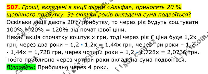 Гроші, вкладені в акції фірми «Альфа», приносять 20 % щорічного прибутку. За скільки років вкладена сума подвоїться? Оскільки акції дають 20% прибутку, то через рік будуть коштувати 100% + 20% = 120% від початкової ціни. Нехай акція спочатку коштує х грн, тоді через рік її ціна буде 1,2х грн, через два роки – 1,2 · 1,2х = 1,44х грн, через три роки – 1,2 ∙ ∙ 1,44х = 1,728 грн, через чотири роки – 1,2 · 1,728х = 2,0736 грн. Тобто приблизно через чотири роки вкладена сума подвоїться. Відповідь: Приблизно через 4 роки.