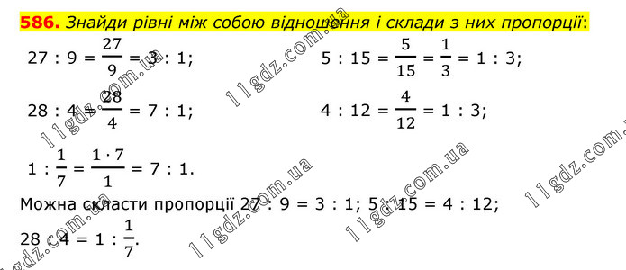 Знайди рівні між собою відношення і склади з них пропорції: 27 : 9 = 27/9 = 3 : 1; 5 : 15 = 5/15 = 1/3 = 1 : 3; 28 : 4 = 28/4 = 7 : 1; 4 : 12 = 4/12 = 1 : 3; 1 : 1/7 = (1 · 7)/1 = 7 : 1. Можна скласти пропорції 27 : 9 = 3 : 1; 5 : 15 = 4 : 12; 28 : 4 = 1 : 1/7.