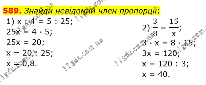 Знайди невідомий член пропорції: 1) х : 4 = 5 : 25; 25х = 4 · 5; 25х = 20; х = 20 : 25; х = 0,8. 2) 3/8 = 15/х; 3 · х = 8 · 15; 3х = 120; х = 120 : 3; х = 40.