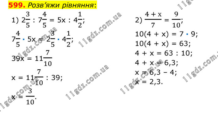 Розв’яжи рівняння: 1) 23/5 : 74/5 = 5х : 41/2; 74/5 · 5х = 23/5 · 41/2; 39х = 117/10 х = 117/10 : 39; х = 3/10. 2) (4 + х)/7 = 9/10; 10(4 + х) = 7 · 9; 10(4 + х) = 63; 4 + х = 63 : 10; 4 + х = 6,3; х = 6,3 – 4; х = 2,3.