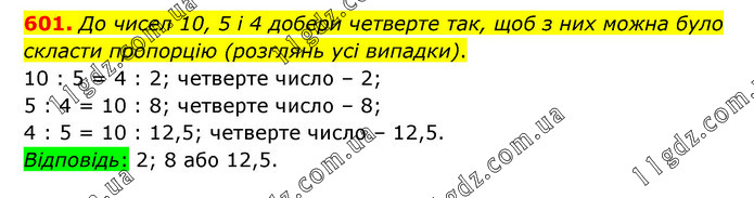 До чисел 10, 5 і 4 добери четверте так, щоб з них можна було скласти пропорцію (розглянь усі випадки). 10 : 5 = 4 : 2; четверте число – 2; 5 : 4 = 10 : 8; четверте число – 8; 4 : 5 = 10 : 12,5; четверте число – 12,5. Відповідь: 2; 8 або 12,5.