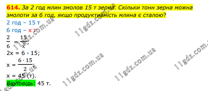 За 2 год млин змолов 15 т зерна. Скільки тонн зерна можна змолоти за 6 год, якщо продуктивність млина є сталою? 2 год – 15 т 6 год – х т 2/6 = 15/х; 2х = 6 · 15; х = (6 · 15)/2; х = 45 (т). Відповідь: 45 т.