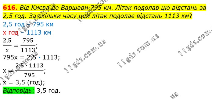 Від Києва до Варшави 795 км. Літак подолав цю відстань за 2,5 год. За скільки часу цей літак подолає відстань 1113 км? 2,5 год – 795 км х год – 1113 км 2,5/х = 795/1113; 795х = 2,5 · 1113; х = (2,5 · 1113)/795; х = 3,5 (год); Відповідь: 3,5 год.