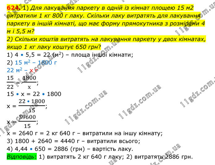1) Для лакування паркету в одній із кімнат площею 15 м2 витратили 1 кг 800 г лаку. Скільки лаку витратять для лакування паркету в іншій кімнаті, що має форму прямокутника з розмірами 4 м і 5,5 м? 2) Скільки коштів витратять на лакування паркету у двох кімнатах, якщо 1 кг лаку коштує 650 грн? 1) 4 • 5,5 = 22 (м2) – площа іншої кімнати; 2) 15 м2 – 1800 г 22 м2 – х г 15/22 = 1800/х; 15 • х = 22 • 1800 х = (22 • 1800)/15; х = 39600/15; х = 2640 г = 2 кг 640 г – витратили на іншу кімнату; 3) 1800 + 2640 = 4440 г – витратили всього; 4) 4,44 • 650 = 2886 (грн) – вартість лаку. Відповідь: 1) витратять 2 кг 640 г лаку; 2) витратять 2886 грн.