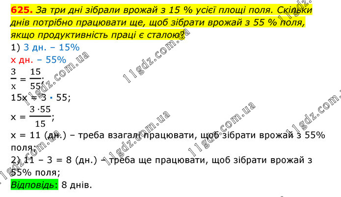 За три дні зібрали врожай з 15 % усієї площі поля. Скільки днів потрібно працювати ще, щоб зібрати врожай з 55 % поля, якщо продуктивність праці є сталою? 1) 3 дн. – 15% х дн. – 55% 3/х = 15/55; 15х = 3 · 55; х = (3 ·55)/15; х = 11 (дн.) – треба взагалі працювати, щоб зібрати врожай з 55% поля; 2) 11 – 3 = 8 (дн.) – треба ще працювати, щоб зібрати врожай з 55% поля; Відповідь: 8 днів.