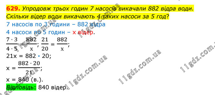 Упродовж трьох годин 7 насосів викачали 882 відра води. Скільки відер води викачають 4 таких насоси за 5 год? 7 насосів по 3 години – 882 відра 4 насоси по 5 годин – х відер. (7 · 3)/(4 · 5) = 882/х; 21/20 = 882/х; 21х = 882 · 20; х = (882 · 20)/21; х = 840 (в.). Відповідь: 840 відер.