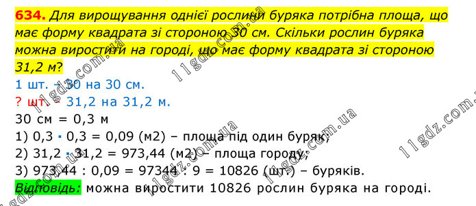 Для вирощування однієї рослини буряка потрібна площа, що має форму квадрата зі стороною 30 см. Скільки рослин буряка можна виростити на городі, що має форму квадрата зі стороною 31,2 м? 1 шт. – З0 на 30 см. ? шт. - 31,2 на 31,2 м. 30 см = 0,3 м 1) 0,3 · 0,3 = 0,09 (м2) – площа під один буряк; 2) 31,2 · 31,2 = 973,44 (м2) – площа городу; 3) 973,44 : 0,09 = 97344 : 9 = 10826 (шт.) – буряків. Відповідь: можна виростити 10826 рослин буряка на городі.