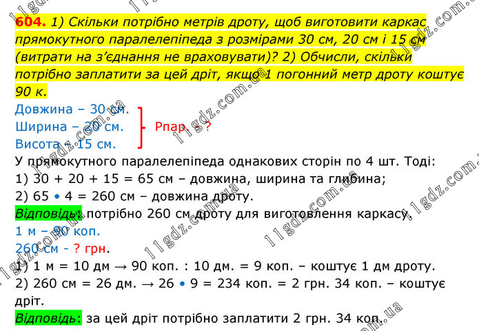 1) Скільки потрібно метрів дроту, щоб виготовити каркас прямокутного паралелепіпеда з розмірами 30 см, 20 см і 15 см (витрати на з’єднання не враховувати)? 2) Обчисли, скільки потрібно заплатити за цей дріт, якщо 1 погонний метр дроту коштує 90 к. Довжина – 30 см. Ширина – 20 см. Рпар. - ? Висота – 15 см. У прямокутного паралелепіпеда однакових сторін по 4 шт. Тоді: 1) 30 + 20 + 15 = 65 см – довжина, ширина та глибина; 2) 65 • 4 = 260 см – довжина дроту. Відповідь: потрібно 260 см дроту для виготовлення каркасу. 1 м – 90 коп. 260 см - ? грн. 1) 1 м = 10 дм → 90 коп. : 10 дм. = 9 коп. – коштує 1 дм дроту. 2) 260 см = 26 дм. → 26 • 9 = 234 коп. = 2 грн. 34 коп. – коштує дріт. Відповідь: за цей дріт потрібно заплатити 2 грн. 34 коп.