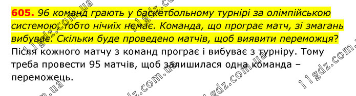 96 команд грають у баскетбольному турнірі за олімпійською системою, тобто нічиїх немає. Команда, що програє матч, зі змагань вибуває. Скільки буде проведено матчів, щоб виявити переможця? Після кожного матчу з команд програє і вибуває з турніру. Тому треба провести 95 матчів, щоб залишилася одна команда – переможець.