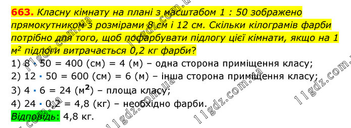 Класну кімнату на плані з масштабом 1 : 50 зображено прямокутником з розмірами 8 см і 12 см. Скільки кілограмів фарби потрібно для того, щоб пофарбувати підлогу цієї кімнати, якщо на 1 м2 підлоги витрачається 0,2 кг фарби? 1) 8 · 50 = 400 (см) = 4 (м) – одна сторона приміщення класу; 2) 12 · 50 = 600 (см) = 6 (м) – інша сторона приміщення класу; 3) 4 · 6 = 24 (м2) – площа класу; 4) 24 · 0,2 = 4,8 (кг) – необхідно фарби. Відповідь: 4,8 кг.
