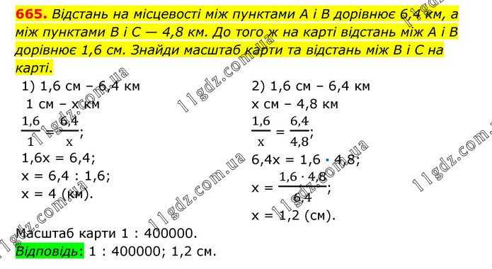 Відстань на місцевості між пунктами A i B дорівнює 6,4 км, а між пунктами В і C — 4,8 км. До того ж на карті відстань між A i B дорівнює 1,6 см. Знайди масштаб карти та відстань між B i C на карті. 1) 1,6 см – 6,4 км 1 см – х км 1,6/1 = 6,4/х; 1,6х = 6,4; х = 6,4 : 1,6; х = 4 (км). 2) 1,6 см – 6,4 км х см – 4,8 км 1,6/х = 6,4/4,8; 6,4х = 1,6 · 4,8; х = (1,6 · 4,8)/6,4; х = 1,2 (см). Масштаб карти 1 : 400000. Відповідь: 1 : 400000; 1,2 см.