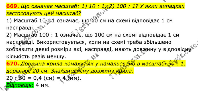 669. Що означає масштаб: 1) 10 : 1; 2) 100 : 1? У яких випадках застосовують цей масштаб? 1) Масштаб 10 : 1 означає, що 10 см на схемі відповідає 1 см насправді. 2) Масштаб 100 : 1 означає, що 100 см на схемі відповідає 1 см насправді. Використовується, коли на схемі треба збільшено зобразити деякі розміри які, насправді, мають довжину у відповідну кількість разів меншу. 670. Довжина крила комахи, як у намальовано в масштабі 50 : 1, дорівнює 20 см. Знайди дійсну довжину крила. 20 : 50 = 0,4 (см) = 4 (мм). Відповідь: 4 мм.