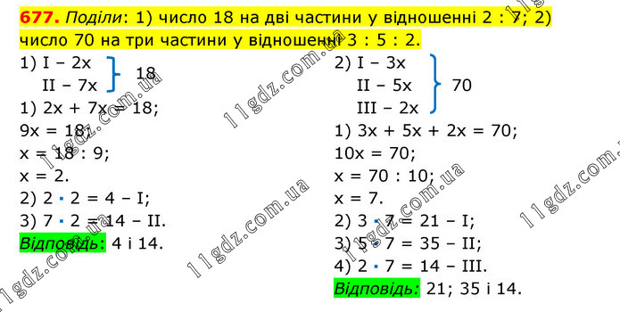 Поділи: 1) число 18 на дві частини у відношенні 2 : 7; 2) число 70 на три частини у відношенні 3 : 5 : 2. 1) І – 2х ІІ – 7х 1) 2х + 7х = 18; 9х = 18; х = 18 : 9; х = 2. 2) 2 · 2 = 4 – І; 3) 7 · 2 = 14 – ІІ. Відповідь: 4 і 14. 2) І – 3х ІІ – 5х 70 ІІІ – 2х 1) 3х + 5х + 2х = 70; 10х = 70; х = 70 : 10; х = 7. 2) 3 · 7 = 21 – І; 3) 5 · 7 = 35 – ІІ; 4) 2 · 7 = 14 – ІІІ. Відповідь: 21; 35 і 14.