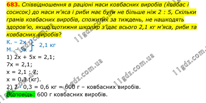 Співвідношення в раціоні маси ковбасних виробів (ковбас і сосисок) до маси м’яса і риби має бути не більше ніж 2 : 5, Скільки грамів ковбасних виробів, спожитих за тиждень, не нашкодять здоров’ю, якщо щотижня школяр з’їдає всього 2,1 кг м’яса, риби та ковбасних виробів? К. – 2х М. – 5х 1) 2х + 5х = 2,1; 7х = 2,1; х = 2,1 : 7; х = 0,3 (кг). 2) 2 · 0,3 = 0,6 кг = 600 г – ковбасних виробів. Відповідь: 600 г ковбасних виробів.