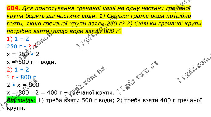 Для приготування гречаної каші на одну частину гречаної крупи беруть дві частини води. 1) Скільки грамів води потрібно взяти, якщо гречаної крупи взяли 250 г? 2) Скільки гречаної крупи потрібно взяти, якщо води взяли 800 г? 1) 1 – 2 250 г - ? г х = 250 • 2 х = 500 г – води. 2) 1 – 2 ? г - 800 г 2 • х = 800 х = 800 : 2 = 400 г – гречаної крупи. Відповідь: 1) треба взяти 500 г води; 2) треба взяти 400 г гречаної крупи.