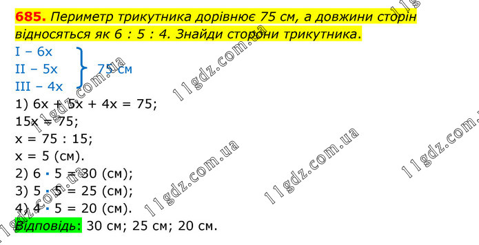 Периметр трикутника дорівнює 75 см, а довжини сторін відносяться як 6 : 5 : 4. Знайди сторони трикутника. І – 6х ІІ – 5х 75 см ІІІ – 4х 1) 6х + 5х + 4х = 75; 15х = 75; х = 75 : 15; х = 5 (см). 2) 6 · 5 = 30 (см); 3) 5 · 5 = 25 (см); 4) 4 · 5 = 20 (см). Відповідь: 30 см; 25 см; 20 см.