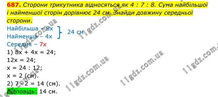 Сторони трикутника відносяться як 4 : 7 : 8. Сума найбільшої і найменшої сторін дорівнює 24 см. Знайди довжину середньої сторони. Найбільша – 8х Найменша – 4х Середня – 7х 1) 8х + 4х = 24; 12х = 24; х = 24 : 12; х = 2 (см). 2) 7 · 2 = 14 (см). Відповідь: 14 см.