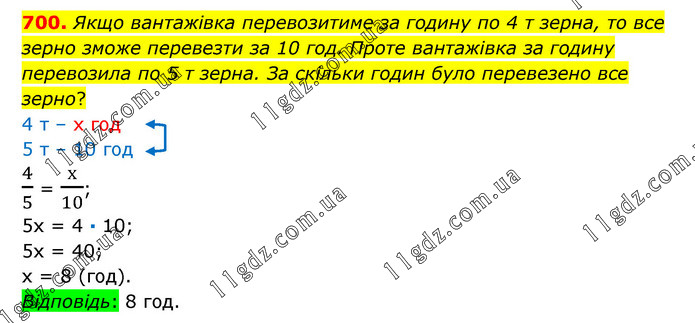 Якщо вантажівка перевозитиме за годину по 4 т зерна, то все зерно зможе перевезти за 10 год. Проте вантажівка за годину перевозила по 5 т зерна. За скільки годин було перевезено все зерно? 4 т – х год 5 т – 10 год 4/5 = х/10; 5х = 4 · 10; 5х = 40; х = 8 (год). Відповідь: 8 год.