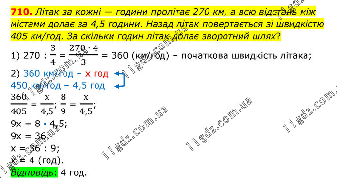 Літак за кожні — години пролітає 270 км, а всю відстань між містами долає за 4,5 години. Назад літак повертається зі швидкістю 405 км/год. За скільки годин літак долає зворотний шлях? 1) 270 : 3/4 = (270 · 4)/3 = 360 (км/год) – початкова швидкість літака; 2) 360 км/год – х год 450 км/год – 4,5 год 360/405 = х/4,5; 8/9 = х/4,5; 9х = 8 · 4,5; 9х = 36; х = 36 : 9; х = 4 (год). Відповідь: 4 год.
