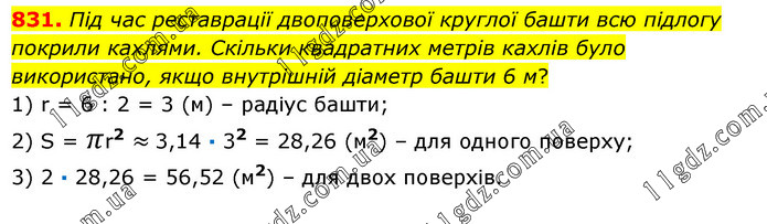 Під час реставрації двоповерхової круглої башти всю підлогу покрили кахлями. Скільки квадратних метрів кахлів було використано, якщо внутрішній діаметр башти 6 м? 1) r = 6 : 2 = 3 (м) – радіус башти; 2) S = πr2 ≈ 3,14 · 32 = 28,26 (м2) – для одного поверху; 3) 2 · 28,26 = 56,52 (м2) – для двох поверхів.