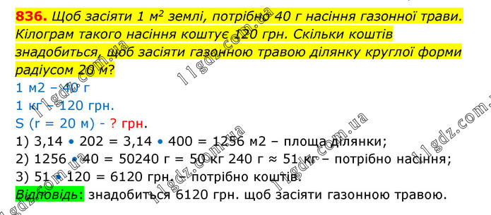 Щоб засіяти 1 м2 землі, потрібно 40 г насіння газонної трави. Кілограм такого насіння коштує 120 грн. Скільки коштів знадобиться, щоб засіяти газонною травою ділянку круглої форми радіусом 20 м? 1 м2 – 40 г 1 кг – 120 грн. S (r = 20 м) - ? грн. 1) 3,14 • 202 = 3,14 • 400 = 1256 м2 – площа ділянки; 2) 1256 • 40 = 50240 г = 50 кг 240 г ≈ 51 кг – потрібно насіння; 3) 51 • 120 = 6120 грн. – потрібно коштів. Відповідь: знадобиться 6120 грн. щоб засіяти газонною травою.