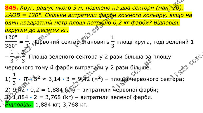 Круг, радіус якого 3 м, поділено на два сектори (мал. 30). ∠AOB = 120°. Скільки витратили фарби кожного кольору, якщо на один квадратний метр площі потрібно 0,2 кг фарби? Відповідь округли до десятих кг. (120°)/(360°) = 1/3. Червоний сектор становить 1/3 площі круга, тоді зелений 1 – 1/3 = 2/3. Площа зеленого сектора у 2 рази більша за площу червоного тому й фарби витратили у 2 рази більше. 1) 1/3 · π · 32 ≈ 3,14 · 3 = 9,42 (м2) – площа червоного сектора; 2) 9,42 · 0,2 = 1,884 (кг) – витратили червоної фарби; 3) 1,884 · 2 = 3,768 (кг) – витратили зеленої фарби. Відповідь: 1,884 кг; 3,768 кг.