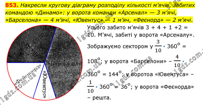 Накресли кругову діаграму розподілу кількості м’ячів, забитих командою «Динамо»: у ворота команди «Арсенал» — 3 м’ячі, «Барселона» — 4 м’ячі, «Ювентус» — 1 м’яч, «Феєнорд» — 2 м’ячі. Усього забито м’ячів 3 + 4 + 1 +2 = 10. М’ячі, забиті у ворота «Арсеналу». Зображуємо сектором у 3/10 · 360° = 108°; у ворота «Барселони» – 4/10 · 360° = 144°; у воротоа «Ювентуса» – 1/10 · 360° = 36°; у ворота «Феєнорда» – решта.