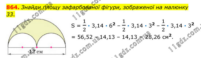 Знайди площу зафарбованої фігури, зображеної на малюнку 33. S = 1/2 · 3,14 · 62 – 1/2 · 3,14 · 32 – 1/2 · 3,14 · 32 = 56,52 – 14,13 – 14,13 = 28,26 см2.