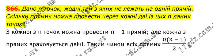 Дано n точок, жодні три з яких не лежать на одній прямій. Скільки прямих можна провести через кожні дві із цих n даних точок? З кожної з n точок можна провести n – 1 прямій; але кожна з прямих враховується двічі. Таким чином всіх прямих (n(n - 1))/2