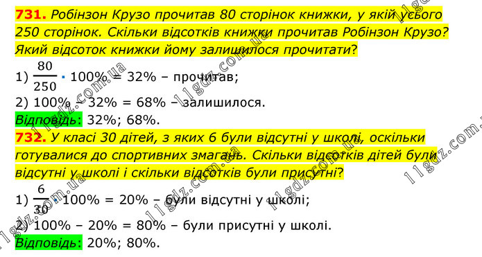 731. Робінзон Крузо прочитав 80 сторінок книжки, у якій усього 250 сторінок. Скільки відсотків книжки прочитав Робінзон Крузо? Який відсоток книжки йому залишилося прочитати? 1) 80/250 · 100% = 32% – прочитав; 2) 100% – 32% = 68% – залишилося. Відповідь: 32%; 68%. 732. У класі 30 дітей, з яких 6 були відсутні у школі, оскільки готувалися до спортивних змагань. Скільки відсотків дітей були відсутні у школі і скільки відсотків були присутні? 1) 6/30 · 100% = 20% – були відсутні у школі; 2) 100% – 20% = 80% – були присутні у школі. Відповідь: 20%; 80%.