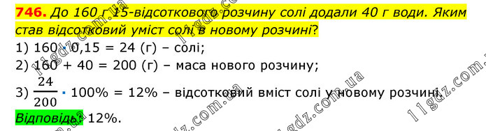 До 160 г 15-відсоткового розчину солі додали 40 г води. Яким став відсотковий уміст солі в новому розчині? 1) 160 · 0,15 = 24 (г) – солі; 2) 160 + 40 = 200 (г) – маса нового розчину; 3) 24/200 · 100% = 12% – відсотковий вміст солі у новому розчині. Відповідь: 12%.